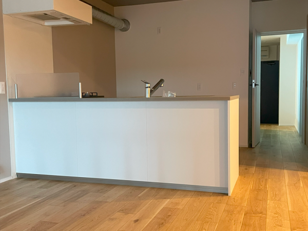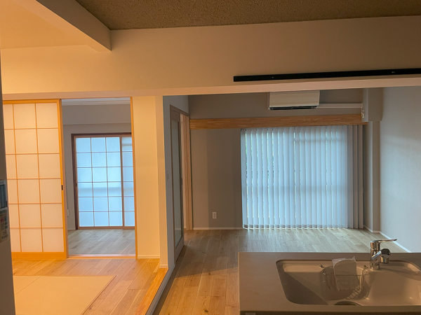 マンションリノベーションに初挑戦! 50㎡程度の狭いマンションを2LDK+ワークスペースの空間へ 洗面を廊下に設置することで広めの間取りに変更 レンジフードがこだわりの物件です。
